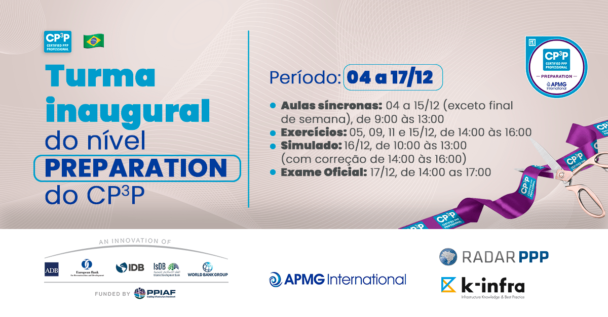 - No Brasil, somente a Radar PPP pode ministrar os cursos para o CP³P em parceria e como afiliada da empresa espanhola K-Infra, uma entidade credenciada pela APMG International como formadora oficial do CP³P.